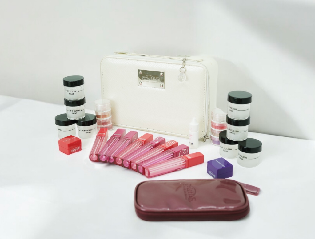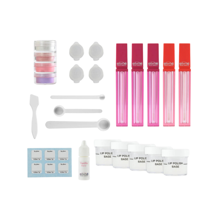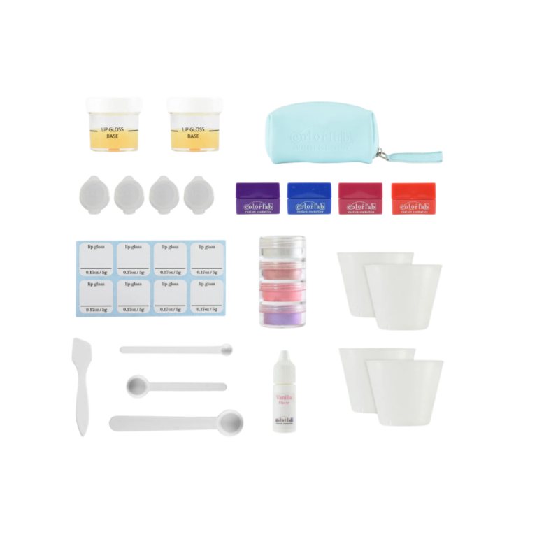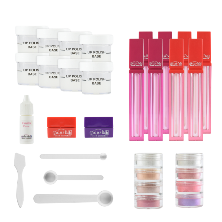 Our premium “Make Your Own” Lip Gloss Kit yields 8 full-sized lip glosses and 2 compact pots. Additionally, this bag features 2 bonus gifts, a white cosmetic bag and a small carrying case for your creations.